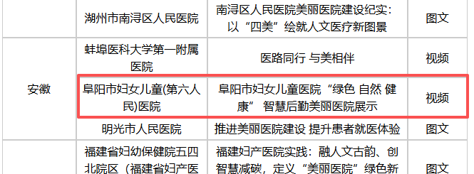 近日,国家卫生健康委人口文化与基层健康中心公布了“2025年‘美丽医院’建设案例征集活动”结果,经过作品征集、材料审核、专家评审等多环节严格筛选,阜阳市妇女儿童医院《“绿色 自然 健康”智慧后勤美丽医院展示》在700多个参赛作品中脱颖而出,获评创新案例。全省仅3家、全市仅1家医院获此荣誉。