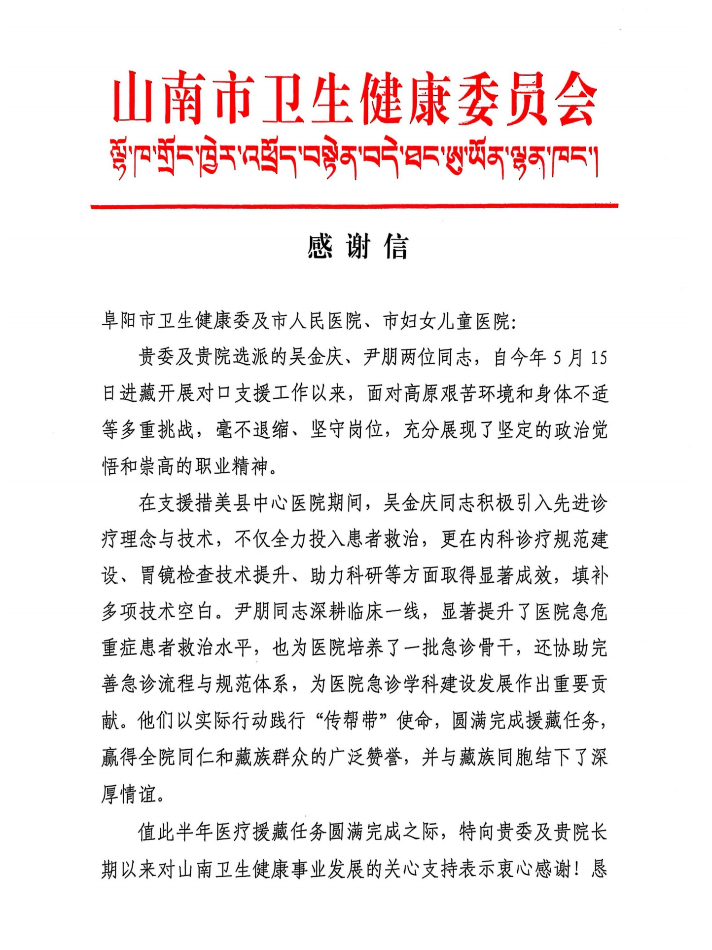 山南市卫生健康委员会在感谢信中特别强调,尹朋同志圆满完成援藏任务,为山南卫生健康事业发展作出了重要贡献,并诚挚邀请我院赴山南市调研指导,深化两地医疗卫生合作。我院将始终牢记社会责任,持续响应国家对口支援政策,不断选派优秀医疗人才投身援藏等公益事业,以实际行动助力优质医疗资源下沉,增进民族情谊。同时,医院也将严格落实援藏干部人才各项政策待遇,给予尹朋同志更多关心关爱,让组织的温暖直达人心。未来,我院将继续以高度的责任担当,为推动医疗卫生事业均衡发展、建设健康中国贡献阜阳市妇女儿童医院的坚实力量!